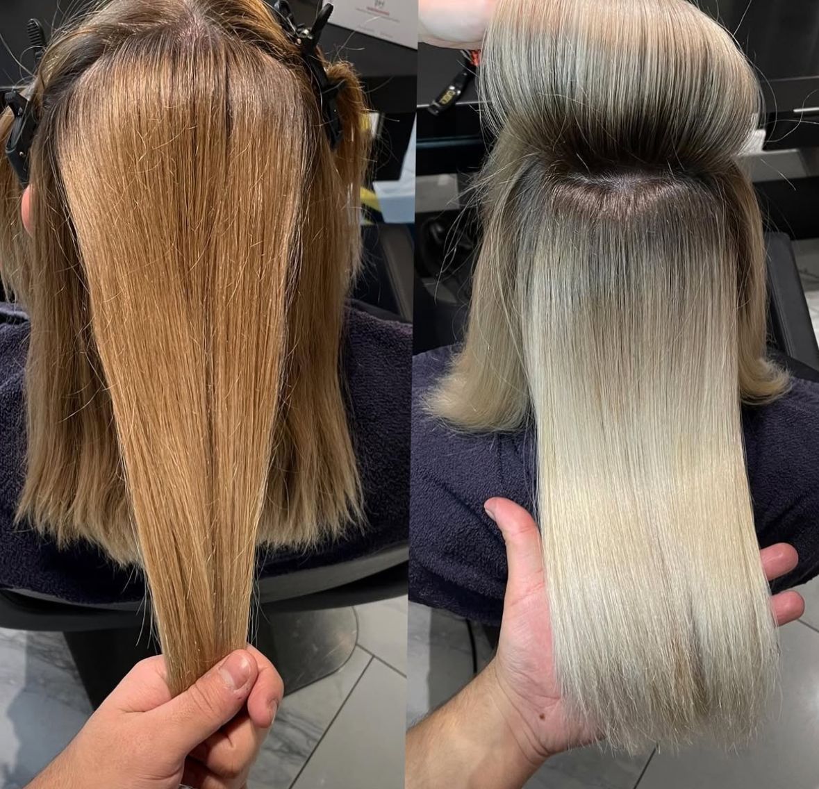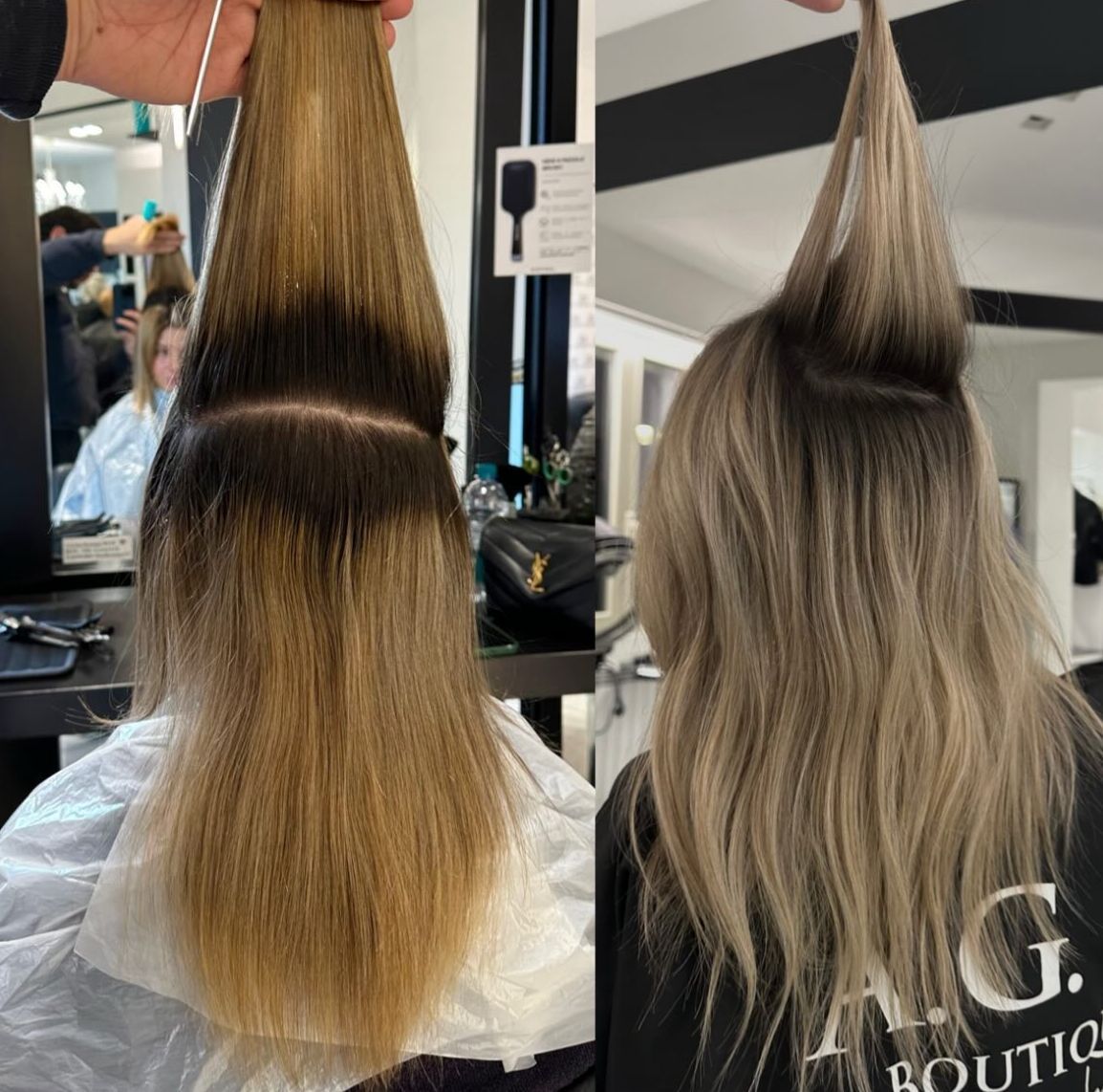 Questo trattamento permette di sfumare la ricrescita, correggere riflessi indesiderati e ravvivare il balayage, donando un effetto naturale e luminoso.